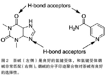 分子間的交叉識(shí)別概念引導(dǎo)發(fā)展出了ExploraSepTM (MIP T echnologies AB, Lund,Sweden)[14]。這一概念是指以一種分子作為模板合成的分子印跡聚合物,不僅對(duì)模板分子有選擇性,對(duì)于具有相互作用的官能團(tuán)、有相似三維空間分布的其他分子也有選擇性。這類似于藥物設(shè)計(jì)中的藥效團(tuán)概念,對(duì)于分離領(lǐng)域來(lái)說(shuō),作者稱其為選擇基。例如在發(fā)展ExploraSep技術(shù)時(shí)發(fā)現(xiàn)以煙堿為模板的酸性分子聚合物對(duì)茶堿也有選擇性。在這一例子中,可以很容易解釋原因。在印跡過(guò)程中最強(qiáng)的相互作用基團(tuán)應(yīng)是嘧啶環(huán)上的氮原子和酰胺鍵上的氧原子。如果將茶堿與煙堿比對(duì),茶堿的氫鍵受體幾乎和煙堿氫鍵受體完全匹配(見(jiàn)圖2)。換句話說(shuō),煙堿可以作為茶堿的模板分子類似物。