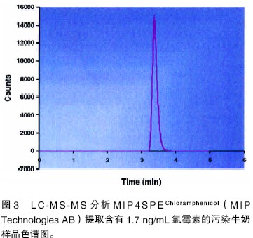 使用ExploraSep 技術(shù),篩選到了幾個(gè)選擇基,選定其中一個(gè)做進(jìn)一步研究。雖然它的原始極性模板分子與氯霉素的選擇基很相似,但結(jié)構(gòu)相差很大。為氯霉素合成的分子印跡聚合物的檢測(cè)限要低于LC-MS-MS方法最低要求的檢測(cè)限(MRPL)(0.3 μg/kg 或0.3 ppb)(見(jiàn)圖3),提高了檢測(cè)的可靠性。該方法的效果等同甚至優(yōu)于免疫檢測(cè)方法,并且沒(méi)有諸如假陽(yáng)性或需要特殊處理步驟的缺點(diǎn)。分子印跡聚合物的選擇性可以保證對(duì)廣泛的樣品種類例如牛奶、尿樣、蝦和蜂蜜都能達(dá)到分析要求。