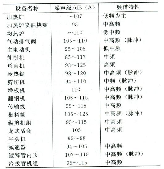 噪聲源 金屬軋制工藝復(fù)雜,在其流程的各個(gè)環(huán)節(jié)如金屬坯料加熱、初軋、成品軋制、精整直到堆垛收集和傳輸轉(zhuǎn)運(yùn)等,都分布有不同類型的噪聲源,其噪聲污染程度一般都比較嚴(yán)重(見表)。主要設(shè)備的A聲級都超過90dB,有的達(dá)到115dB以上。按照聲源特性區(qū)分,機(jī)械噪聲、空氣動(dòng)力性噪聲、電磁噪聲、燃燒噪聲均有。就一般而言,以機(jī)械性噪聲最為突出。其中尤以各種半成品的鋸切沖剪噪聲,中薄板的傳輸噪聲,鋼管噴吹噪聲,管材的軋制、收集打捆噪聲以及錘鍛噪聲,軌梁的矯直機(jī)噪聲等強(qiáng)度高,影響面大。