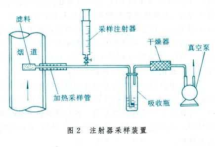 試樣采集由于氣體在煙道內分布比較均勻,且無慣性影響,因此不需要在采樣斷面上多點采樣,也不用等速采樣,只要在靠近煙道中心的任一點上就可以采集到具有代表性試樣。從煙道中采集氣體試樣的裝置有兩種:一種是待測成分濃度較低需要進行濃縮時,用吸收法采樣裝置;另一種是當分析所需氣量較少時,采用注射器采樣裝置。兩種采樣裝置的組成如圖1、圖2所示。