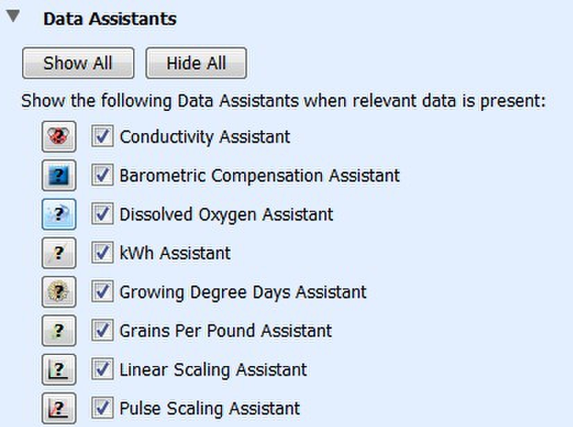 當(dāng)你讀一個(gè)記錄器或打開 數(shù)據(jù)文件,所有兼容的數(shù)據(jù)助理是默認(rèn)列在圖 設(shè)置窗口。取消復(fù)選框的任何助手,你不想在情節(jié)設(shè)置窗口顯示;蛘,單擊“顯示所有在情節(jié)設(shè)置窗口顯示所有兼容的助手或隱藏所有顯示沒有人。