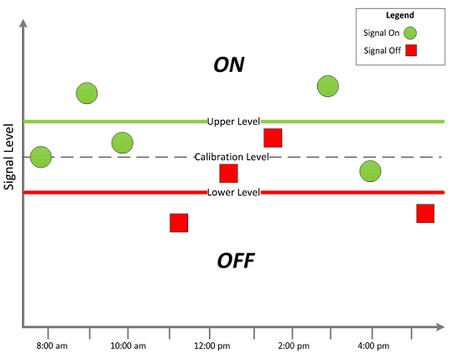 該記錄儀有一個內(nèi)置的滯后約12.5%的水平,以防止光傳感器或電動機傳感器在ON和OFF時的信號電平附近的校準閾值6.25%之間切換。該圖顯示,記錄儀如何處理滯后。該記錄儀的信號解釋為ON,直到低于校準閾值水平較低。一旦切換為關(guān)閉時,該信號將不會切換為ON狀態(tài)直到它繞過校準水平的上限。 注:廣州市駿凱電子科技有限公司是美國ONSET公司HOBO記錄儀大中華區(qū)代理商!HOBO官網(wǎng) :http://www.hobochina.cn/