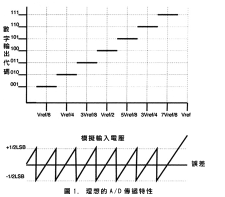 量化是最基本誤差,用圖1所示的簡(jiǎn)單3bit轉(zhuǎn)換器來(lái)說(shuō)明,輸入電壓被數(shù)化,以8個(gè)離散電平來(lái)劃分,分別由代碼000至111去代表它們,每一代碼跨越Vref/8 的電壓范圍(以n bit轉(zhuǎn)換器來(lái)講這是由Vref/2n計(jì)算出)。代碼大小一般被定義為一個(gè)最低有效位(LSB),若假定Vref = 8V的話(huà),每一代碼之間的電壓變化就代表1V。換言之,產(chǎn)生指定代碼的實(shí)際電壓與代表該碼的電壓兩者之間存有誤差。一般來(lái)講,0.5LSB偏移加入到輸入端便導(dǎo)致在理想過(guò)渡點(diǎn)上有+/-0.5LSB的量化誤差,在上述例子中即是有+/-0.5V誤差。