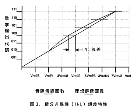 積分非線(xiàn)性(INL)是DNL誤差的數(shù)學(xué)積分,即是說(shuō)一個(gè)具有良好INL的ADC保證有良好的DNL。INL乃描述轉(zhuǎn)換器與理想線(xiàn)性傳遞函數(shù)的偏差,如圖3所示,制造商普遍有兩種不同方法去測(cè)量INL,對(duì)於設(shè)計(jì)師的“端點(diǎn)”及“最佳適配”是有重要推斷。