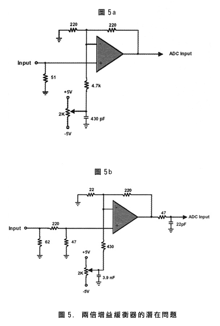 圖5a所示為一個(gè)具有2倍增益的緩沖器,這里有兩個(gè)潛在問(wèn)題,首先,大多數(shù)取樣ADC的輸入端是一個(gè)開(kāi)關(guān)式電容器負(fù)荷,這類(lèi)電路可以從輸入引腳輸出能量。故此它構(gòu)成了放大器輸出振鈴或振蕩是有可能的。聰明的防預(yù)措施是用RC網(wǎng)絡(luò)來(lái)把輸出退耦合,如圖5b所示。