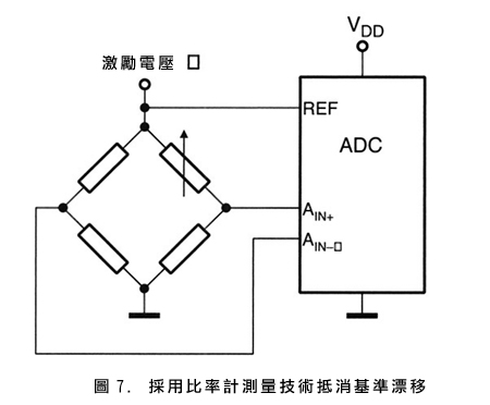 有一種技術(shù)可減低對(duì)甚低漂移元件的需求,這是采用如圖7所示的比率計(jì)測(cè)量,基準(zhǔn)把傳感器連同ADC饋入,有效地抵消基準(zhǔn)電壓上的任何漂移,因它一同影響ADC與模擬輸入。