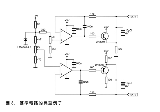 圖8為一個(gè)典型的基準(zhǔn)電路,可用來(lái)加快比如National ADC1175之類(lèi)的低功率ADC;鶞(zhǔn)輸出經(jīng)濟(jì)緩沖,以提供ADC輸入所需的低阻抗驅(qū)動(dòng)。選用的拉上電阻數(shù)值是要足夠低,才保證基準(zhǔn)二極管在其溫度范圍內(nèi)有低漂移。