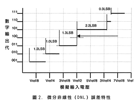 由於圖1所示是一個(gè)理想的轉(zhuǎn)換器。其碼至碼過(guò)渡點(diǎn)相隔1LSB,然而,在實(shí)際ADC當(dāng)中情況不是這樣,出現(xiàn)了微分非線(xiàn)性(DNL)誤差,正如圖2所示。代碼010及011之間過(guò)渡有一個(gè)0的DNL。因?yàn)閯偤? LSB?墒,000至001過(guò)渡就有一個(gè)+0.2 LSB的DNL,因它有1.2 LSB的代碼寬度。倘若DNL誤差被指為大於+/- 1 LSB的話(huà)。該轉(zhuǎn)換器就可能有漏失碼,代碼100永不出現(xiàn)在輸出端,因?yàn)?a href="http://lizhong-valve.com/class24.html">轉(zhuǎn)換器給代碼101有2.2的DNL值∶應(yīng)要注意,在數(shù)據(jù)書(shū)上如沒(méi)有清楚說(shuō)明DNL數(shù)字的話(huà),可視該轉(zhuǎn)換器為沒(méi)有漏碼,暗示它有優(yōu)於+/- 1 LSB的DNL數(shù)字,譬如Microchip MCP320X 12 bit轉(zhuǎn)換器系列在數(shù)據(jù)書(shū)訂明為+/- 1 LSB DNL。