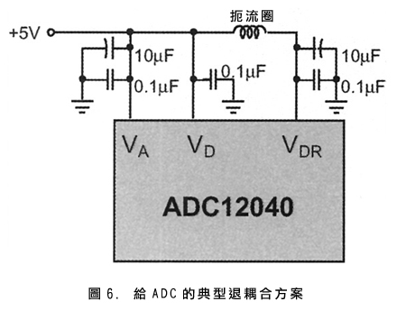 圖6所示為給National ADC12040的一個(gè)良好退耦合方法。挑選備有優(yōu)良電源抑制比(PSRR)的ADC和緩沖器亦可減少這影響(但須留意PSRR會(huì)隨頻率增加而下降)。
