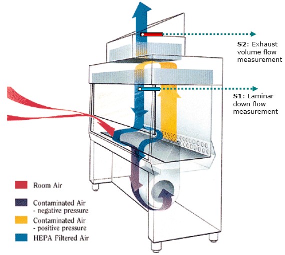 管理這樣復(fù)雜的氣流模式需要精確氣流至少在兩個點的測量:一是在向下流動的過濾器,一個在所述排氣路徑保證恒定的空氣去除從一個房間到BSC用盡。