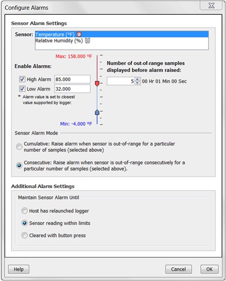 (UX100系列和U14-00X)(UA-001)的數(shù)目”,這是需要觸發(fā)每個(gè)報(bào)警該樣本的數(shù)目。 例如,我們已經(jīng)將此數(shù)設(shè)置為5。 這意味著將需要5傳感器讀數(shù)高于85°F或低于32°F之前,報(bào)警器就會(huì)跳閘。 該時(shí)間表示,將采取報(bào)警的基礎(chǔ)上數(shù)量寫(xiě)輸入或樣品,并記錄間隔(UA-001記錄儀)在LCD的刷新率(UX100系列和U14-00X)的跳閘多久。 在上面的例子中,它會(huì)采取報(bào)警1分鐘跳閘(僅當(dāng)在下一步中所述連續(xù)被選中)。 注:UA-001和U14-00X記錄儀有兩個(gè)“號(hào)外的范圍樣......“ 字段:一個(gè)用于高報(bào)警和單獨(dú)一個(gè)用于低報(bào)警。