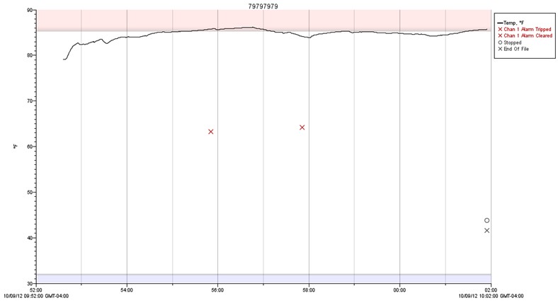 當(dāng)你讀出記錄儀,高低溫報(bào)警值將顯示在圖上。 在下面的例子中,溫度升高到高于85°F等等這些讀數(shù)是在紅色,或高報(bào)警,劇情部分。 溫度不會(huì)低于報(bào)警低限,這是劇情的底部的藍(lán)色部分。 UX100系列數(shù)據(jù)采集器也顯示報(bào)警事件顯示,當(dāng)報(bào)警被觸發(fā)(如果適用的清除)。 在這個(gè)例子中,有“查看1報(bào)警跳閘”和“查看1報(bào)警清除”事件顯示,當(dāng)溫度報(bào)警跳閘和清除。 在“通道1報(bào)警清除”事件包含了最遠(yuǎn)超出范圍的傳感器之前的報(bào)警清除(見(jiàn)分表實(shí)際值)的值。