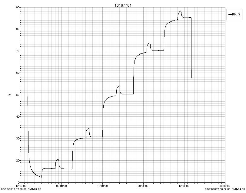 這是用于測(cè)試HOBO數(shù)據(jù)記錄器在Sensirion的相對(duì)濕度傳感器所建議的程序25 °C ( 77°F)在一個(gè)恒溫恒濕試驗(yàn)箱,如迅雷科技公司模型指出在上一節(jié)中,為20升每分鐘的氣流。此過(guò)程涉及全方位%RH的(在15%,30 %RH, 50%RH ,70%RH和85 %RH)的同時(shí),還檢測(cè)每個(gè)測(cè)量的滯后。與HOBOware啟動(dòng)記錄儀®之前將其放置在室內(nèi)。編程室運(yùn)行如下: