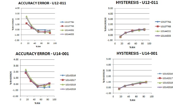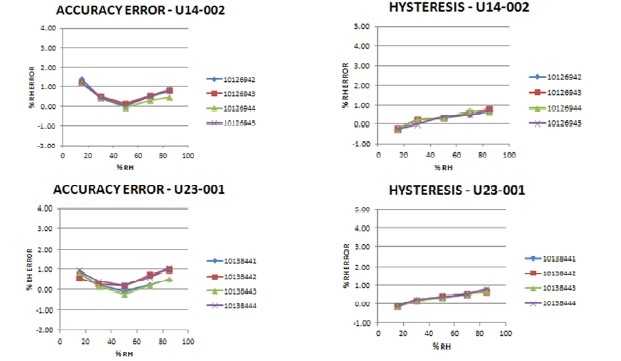 S-THB-M002 , U23-001 ,和UX100-011 。請(qǐng)注意, U14 -002智能傳感器S-THB-M002具有相同的傳感器配置為U23-002和所有的智能傳感器的產(chǎn)品,如H21 , H22,和U30系列。下面是準(zhǔn)確度和滯后曲線為使用前一節(jié)中所描述的計(jì)算每個(gè)模型。