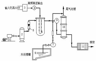 1—無油空壓機;2—干燥器;3—高壓脈沖電源;4—示波器;5—流量計;6—放電室;7—流量計;