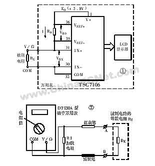 在陳述加載降壓測(cè)量法之前,要先介紹比例法測(cè)量電阻的原理。比例法測(cè)量電阻原理圖如圖1所示。圖中線框內(nèi)部分為萬(wàn)用表內(nèi)部電路。從圖中可看出,將被測(cè)電阻Rx接在萬(wàn)用表兩端,相當(dāng)于將Rx與基準(zhǔn)電阻Ro串聯(lián)后接在集成塊TSC7106的V+引腳與COM引腳之間。將萬(wàn)用表撥到電阻擋后,TSC7106的基準(zhǔn)電源Eo向Ro和Rx提供測(cè)試電流I,Ro上的壓降VRo提供測(cè)試電壓VRX,并作為集成塊TSC7106的基準(zhǔn)電壓VREF,而VRX又是輸入電壓VIN。輸入電壓VIN與基準(zhǔn)電壓的關(guān)系式為:VIN/VRO=VRX/VRO=RX/RO,由該式求得RX=RO/VRO.VRX,VRX=RX/RO.VRO。這就是比例法測(cè)量電阻的基本原理。由VRX=RX/RO.VRO不難看出,在萬(wàn)且表的同一電阻擋,若被測(cè)電阻越小,其兩端的測(cè)試電壓也越小,短路時(shí),即萬(wàn)用表顯示“000”時(shí),被測(cè)電阻RX=0,則測(cè)試電壓VRX=0;反之,隨著被測(cè)電阻RX的不斷增大,其兩端的測(cè)試電壓VRX也隨之增大。當(dāng)萬(wàn)用表顯示“1000”時(shí),即RX=RO時(shí),測(cè)試電壓VRX=VRO。當(dāng)被測(cè)電阻達(dá)到RX=2RO,即滿量程時(shí),顯示溢出符號(hào)“1”,此時(shí)被測(cè)電阻兩端的測(cè)試電壓VRX=2VRO。當(dāng)被測(cè)電阻開路時(shí),其測(cè)試電壓達(dá)到最大值約0.65V(典型值)。由于DT830A型數(shù)字萬(wàn)用表各電阻擋的開路電壓(空載輸出電壓)約為0.65V,所以不能直接測(cè)量在線電阻,因?yàn)檫@樣高的測(cè)試電壓足以便被測(cè)電路中的硅管(在正向測(cè)量時(shí))趨于導(dǎo)通,從而影響測(cè)量經(jīng)果。根據(jù)被測(cè)電阻與測(cè)試電壓之間的變化規(guī)律不難想到:若我們?cè)跍y(cè)量在線電阻之前,先在數(shù)字萬(wàn)用表的V/Ω與COM插孔之間,即兩表筆之間,跨接一個(gè)電阻R1,也就是預(yù)先中一個(gè)負(fù)載電阻,把數(shù)字萬(wàn)且表在該電阻擋的測(cè)試電壓降下來(lái)。只要R1的阻值選得合適,就能使其最大測(cè)試電壓被限制在0.3V以下(不大于0.3V)。鑒于目前國(guó)內(nèi)外普遍使用硅管,鍺管極少見,而硅管在0.35V電壓下仍處于截止?fàn)顟B(tài),因此可以忽略硅管對(duì)被測(cè)電路的并聯(lián)作用(可將硅管視為開路),所以這種方法能夠用來(lái)測(cè)量晶體管在線電阻,這就是加載降壓測(cè)量法。用此方法測(cè)量在線電阻時(shí),各電阻擋的最大測(cè)試電壓距上限0.35V應(yīng)留有一定的余量,通常取最大測(cè)試電壓小于等于0.3V。)用加載降壓測(cè)量法測(cè)量在線電阻的電路連接如圖2所示。