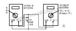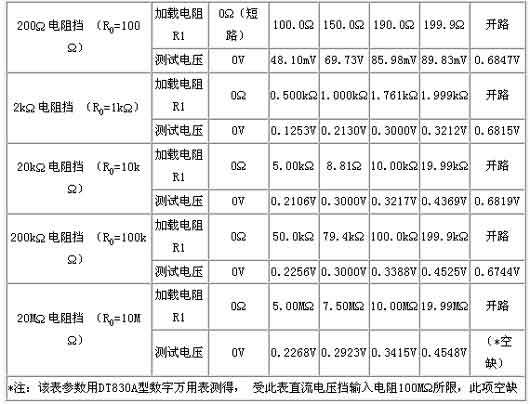由附表可以看出,DT830A數(shù)字萬(wàn)用表的200Ω擋對(duì)R1取值范圍要求最寬松,2kΩ朱如何要R1≤1.76kΩ就能滿足要求,其他高擋對(duì)R1的取值就不一、一列舉了。為了便于記憶和方便用,200Ω擋和2kΩ擋一般取R1=RO(或0.1R0≤R1≤R0)而對(duì)于2kΩ以上各電阻擋通常取0.1R0≤R1≤0.75R。R1的取值不能太小,否則將影響該電阻擋的測(cè)量范圍。若R1取得太小,則RX>>R1,從而使R與R1的數(shù)值非常接近,這樣會(huì)使測(cè)量誤差明顯增大(因?yàn)閿?shù)字萬(wàn)用表本身存在±1個(gè)字的誤差),所以通常取R1的下限為0.1Ro。對(duì)于DT830A型數(shù)字萬(wàn)用表,只要按照上述要求合理選取R1,就可以使各電阻擋的最大測(cè)試電壓被限制在0.3V以下,從而能滿足測(cè)量在線電阻的要求。加載降壓測(cè)量法對(duì)于其它型號(hào)的數(shù)字萬(wàn)用表同樣適用。
