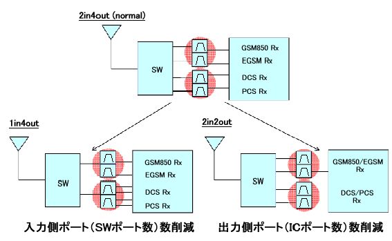 在手機的高頻率無線通信電路中使用的表面波濾波器,分為CDMA收發(fā)用的級間濾波器和GSM用的TOP濾波器等。村田的濾波器不僅具有低損耗和高抑制度的電特性,還由小型、薄型的各種產品尺寸構成了豐富的商品線,可以對應各種電路設計的需求。例如, 在多頻段發(fā)展的高頻無線通信電路中,為了減小電路基板上的貼裝面積,將兩個頻帶的單濾波器(產品尺寸1.35×1.05×0.5mm)合二為一,制造出了雙濾波器(產品尺寸1.8×1.35×0.5mm)。此外還運用特殊的技術制造許多獨特的商品,如將雙層濾波器的輸入端合并為一個的1in4out產品,以及將平衡器的輸出端合并為一的2in2out產品等。通過共用輸入端可以節(jié)省原本用于分頻的開關(SW)。同時,共用平衡輸出端可以使連接濾波器的高頻IC的端口數(shù)目減少(圖3)。這是在表面波濾波器的設計中通過調整阻抗和相位等方法,從而使差分端口實現(xiàn)共用。這些濾波器可以在多頻帶化發(fā)展的高頻無線電路中,為外圍電路的簡化及電路整體的小型化做出貢獻。今后村田制作所將繼續(xù)致力于研發(fā)更小型化和高性能化,同時又具有輸入端以及輸出端共用功能的單濾波器、雙濾波器產品。