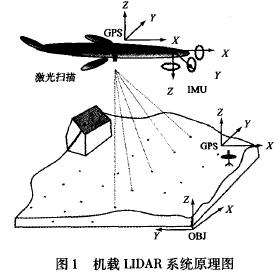 傳感器的位置信息后,能夠準(zhǔn)確地計(jì)算出激光脈沖所到達(dá)地面的每個(gè)光斑的三維坐標(biāo)。此外,由點(diǎn)形成線靠行掃描技術(shù),由線形成面靠觀測平臺(tái)的運(yùn)動(dòng)完成,最終使激光點(diǎn)均勻布滿整個(gè)面,其系統(tǒng)原理如圖1所示。