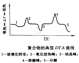 在熱分析儀器中,差熱分析儀是使用得最早和最為廣泛的一種熱分析儀器。差熱分析是在程序控制溫度下,測(cè)量物質(zhì)和參比物的溫度差和溫度關(guān)系的一種技術(shù)。當(dāng)試樣發(fā)生任何物理或化學(xué)變化時(shí),所釋放或吸收的熱量使樣品溫度高于或低于參比物的溫度,從而相應(yīng)地在差熱曲線(xiàn)上可得到放熱或吸熱峰。差熱曲線(xiàn)是由差熱分析儀所測(cè)定而記錄下的△T-T 曲線(xiàn),曲線(xiàn)的縱坐標(biāo)為樣品與參比物的溫度差(△T),向上表示放熱反應(yīng),向下表示吸熱反應(yīng)。差熱分析也可測(cè)定樣品的熱容變化,它在差熱曲線(xiàn)上反映出基線(xiàn)的偏離。例如聚合物的典型DTA 曲線(xiàn)顯示出聚合物隨溫度升高所產(chǎn)生的玻璃化轉(zhuǎn)變、結(jié)晶、熔融、氧化和分解等過(guò)程,如下圖所示。