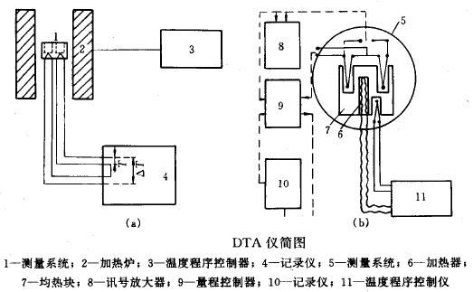 差熱分析儀主要由加熱爐、溫差檢測(cè)器、溫度程序控制儀、訊號(hào)放大器、量程控制器、記錄儀和氣氛控制設(shè)備等所組成。DTA 儀的示意圖如下圖所示,其測(cè)量系統(tǒng)主要是溫差檢測(cè)器。處在加熱爐中的試樣和參比物在相同的條件下加熱或冷卻,爐溫的程序控制由控溫?zé)犭娕急O(jiān)控。試樣和參比物之間的溫差通常用對(duì)接的兩支熱電偶進(jìn)行測(cè)定,熱電偶的兩個(gè)接點(diǎn)分別與盛裝試樣和參比物的坩堝底部相接觸(見(jiàn)下圖(a)),或者分別直接插入樣品和參比物中(如下圖(b)),F(xiàn)在大多數(shù)的DTA 儀采用前一種方法,由于該法的差熱電偶與坩堝底部接觸好,靈敏度較高。而后一種由于差熱電偶和試樣直接接觸,熱電偶易被腐蝕和污染。由于熱電偶的電動(dòng)勢(shì)與試樣和參比物之間的溫差成正比,溫差電動(dòng)勢(shì)經(jīng)微伏放大器和量程控制器放大后由x-y 記錄儀直接把試樣和參比物之間的溫差△T 記錄下來(lái)。在此同時(shí),x - y 記錄儀也記錄下試樣的溫度(或時(shí)間t ) ,這樣就可獲得差熱分析曲線(xiàn)即△T-T (t)圖。應(yīng)注意,在測(cè)定時(shí)所采用的參比物應(yīng)是惰性材料即在測(cè)定的條件下不產(chǎn)生任何熱效應(yīng)的材料。由于現(xiàn)代差熱分析儀的檢測(cè)靈敏度是很高的,所以它能檢測(cè)試樣中所發(fā)生的各種物理和化學(xué)變化如晶型的變化、比熱、相變和分解反應(yīng)等等。
