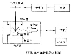 以寬頻帶的紅外光源發(fā)出的光進入干涉儀(一般為邁克爾遜干涉儀),進行調(diào)制后,通過KBr 晶體的窗口進入光聲池,照射在樣品上。樣品吸收這種調(diào)制的有特征頻率干涉光后,產(chǎn)生相應(yīng)的光聲信號,由微音器接收,經(jīng)前置放大器放大后,送入傅里葉變換紅外光譜儀系統(tǒng),經(jīng)計算機傅里葉變換和處理后而得到光聲光譜圖,這種光譜與普通FTIR 紅外吸收光譜是一致的,除特別情況下,可用一般紅外光譜圖進行釋譜。