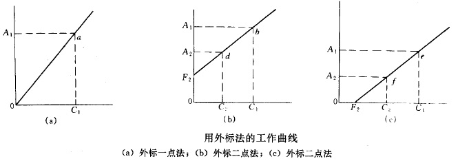 定量時(shí)同時(shí)在板上點(diǎn)上已知濃度的標(biāo)準(zhǔn)品溶液。可分為1 點(diǎn)法和2 點(diǎn)法,當(dāng)工作曲線是通過(guò)原點(diǎn)的直線時(shí),選用一種濃度的標(biāo)準(zhǔn)品-一點(diǎn)法;當(dāng)工作曲線不通過(guò)原點(diǎn)時(shí),選用兩種濃度的標(biāo)準(zhǔn)品-二點(diǎn)法。兩種方法的校正不僅可以對(duì)一個(gè)標(biāo)準(zhǔn)品斑點(diǎn),還可以對(duì)兩個(gè)或四個(gè)同樣量的標(biāo)準(zhǔn)品斑點(diǎn)的測(cè)得值進(jìn)行平均后計(jì)算。下圖為外標(biāo)一點(diǎn)法和二點(diǎn)法的工作曲線。外標(biāo)法是薄層掃描時(shí)最常用的定量方法。