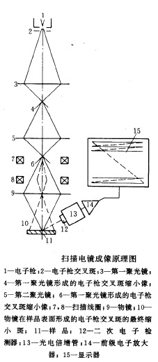 掃描電鏡成像原理 掃描成像原理如下圖所示,電子槍1(鎢絲槍或LaB6槍或場發(fā)射槍等)發(fā)射一束電子,這就是電子源,其最少截面的直徑為d0,對鎢絲槍而言大約為20~50μm (場發(fā)射槍大約為10~20nm ) ,這個小束斑經3 和5 兩級聚光鏡進一步縮小幾百倍,最后再經物鏡縮小并聚焦在樣品面上,這時束斑10 直徑最小可到3~6nm (約小于掃描電鏡的分辨本領),電子束打在樣品上,就產生上節(jié)所述的各種信號。二次電子和背散射電子信號是最常用的兩種信號,尤其是二次電子。信號由接收器取出,經光電倍增器和電子放大器放大后,作為視頻信號去調制高分辨顯示器的亮度,因此顯示器上這一點的亮度與電子束打在樣品上那一點的二次電子發(fā)射強度相對應。由于樣品上各點形貌等各異,其二次電子發(fā)射強度不同,因此顯示器屏上對應的點的亮度也不同。用同一個掃描