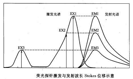 熒光探針大多是含有共扼雙鍵體系的有機(jī)化合物,容易吸收近紫外區(qū)或可見(jiàn)光區(qū)的激發(fā)光,而發(fā)射出可見(jiàn)光區(qū)的光。熒光探針只能吸收或發(fā)射一定波長(zhǎng)范圍內(nèi)的光。探針的發(fā)射波長(zhǎng)總是大于其激發(fā)波長(zhǎng),該波長(zhǎng)差值稱為Stokes位移。