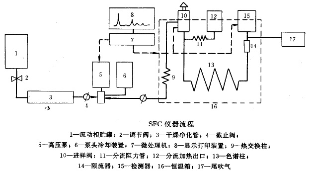 超臨界流體色譜儀的典型流程如下圖,它大體上分成三個(gè)部分即流動(dòng)相系統(tǒng)、分離系統(tǒng)和檢測(cè)系統(tǒng)。流動(dòng)相系統(tǒng)主要包括流動(dòng)相貯罐、流動(dòng)相干燥凈化以及流動(dòng)相的加壓、計(jì)量、顯示等,分離系統(tǒng)主要是分離用的色譜柱、恒溫箱以及進(jìn)樣、分流裝置,檢測(cè)系統(tǒng)包括檢測(cè)器,微處理機(jī)以及記錄、顯示和打印裝置。