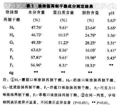 涂抹型再制干酪的水分含量、蛋白質(zhì)含量、脂肪含量、pH 結(jié)果見表1。