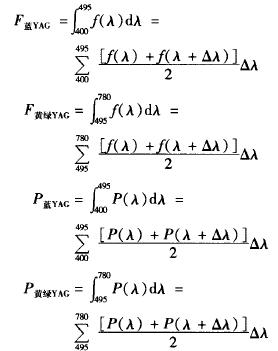由于白光LED的光譜曲線為非規(guī)則光滑曲線,直接計(jì)算積分將有一定困難,其積分可采用光譜曲線所包含的面積近似代替,通過計(jì)算可得采用YAG熒光粉封裝的白光LED在經(jīng)過8周老化前后藍(lán)光及黃綠光部分光譜能量為: