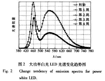 大功率白光LED經(jīng)過4周時(shí)間的老化,其光譜變化情況如圖2所示。