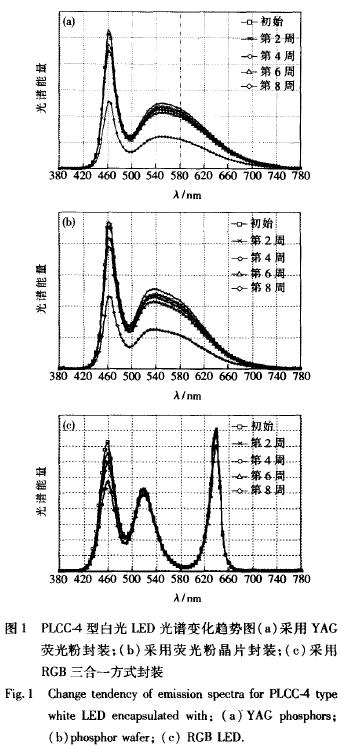 PLCC-4型白光LED經(jīng)過8周時(shí)間的老化,其光譜變化情況如圖1所示,其中(a)為采用YAG熒光粉封裝;(b)為采用熒光粉晶片封裝;(c)為采用RGB三合一方式封裝。
