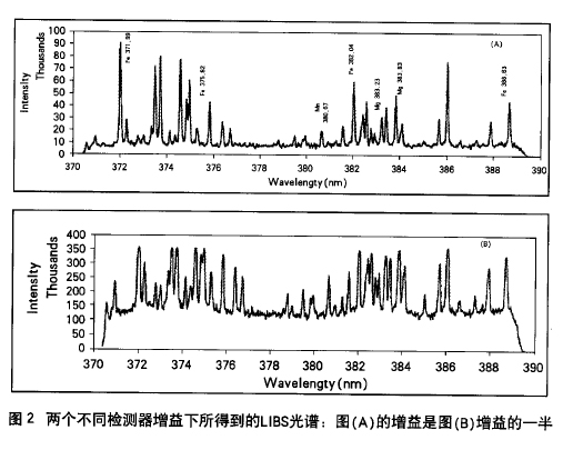 在最初的實(shí)驗(yàn)中,ICCD的增益值設(shè)得很高,導(dǎo)致S/B差。將檢測(cè)器增益降低一半,可以得到較高S/B的UBS光譜圖。圖2表明了檢測(cè)器在兩種不同的增益下所記錄的LIBS光譜圖。在圖2(B)中設(shè)定的增益是圖2(A)的兩倍,從圖中可以看出圖2(B)的S/B低,因?yàn)槭褂幂^高的增益,強(qiáng)的分析信號(hào)被飽和,產(chǎn)生較差的S/B。設(shè)置較低的增益,能夠在較短的延遲時(shí)間內(nèi)把LIBS信號(hào)記錄下來(lái),但依[日有好的S/B。因而在目前的實(shí)驗(yàn)裝置中,檢測(cè)增益值的設(shè)置也是一個(gè)重要的參數(shù)。