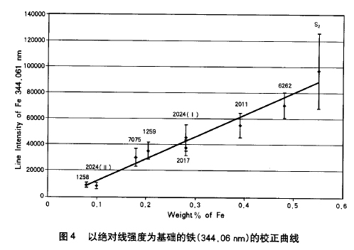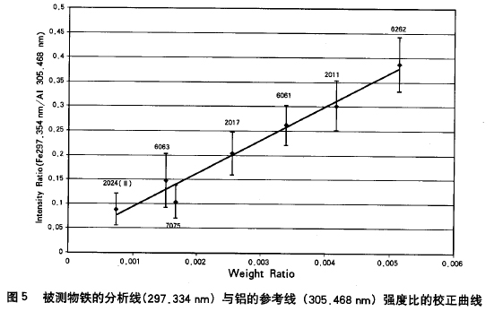 最后經(jīng)過(guò)優(yōu)化上述實(shí)驗(yàn)參數(shù),使用不同的鋁合金試樣得到校正曲線,其組成見(jiàn)表l。列于表2中的銅、鉻、錳、鐵和鋅的分析線,用于獲得校正曲線。校正曲線的質(zhì)量分?jǐn)?shù)的線性范圍可高達(dá)5%。圖4是鋁合金中鐵元素的典型校正曲線。此外,利用一個(gè)元素分析線強(qiáng)度對(duì)另一元素的參考分析線強(qiáng)度的比值而得到的校正數(shù)據(jù),評(píng)述了一種降低實(shí)驗(yàn)偏差影響的校正方法。校正曲線是利用Mg 383.829nm/Fe 388.6282nm、Cr 359.349 nm/Fe 364.7842 nm、Mn 404.136nm/Fe 406,3594 nm、 zn 404.136 nm/Fe344.0606nm以及Fe 297.354nm/Al 305.467nm的強(qiáng)度比值而得到的(圖5是采用該方法得到的典型校正曲線)。校正曲線的線性非常好。這類校正曲線在現(xiàn)場(chǎng)分析試樣的情況下是有用的,因?yàn)樵诂F(xiàn)場(chǎng)分析階情況下,實(shí)驗(yàn)條件在實(shí)驗(yàn)過(guò)程中有可能會(huì)改變。