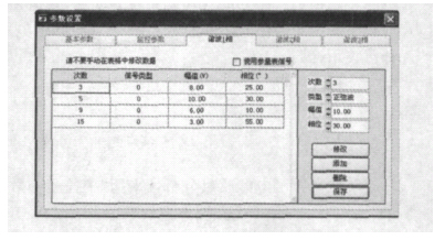 ①信號源:主要是仿真時的信號源,即隨機(jī)生成的正弦信號、多階諧波信號和噪聲的疊加。正弦信號(基波) 由隨機(jī)函數(shù)rand( ) 產(chǎn)生的相位值給正弦波函數(shù)SineWave( ) 作參數(shù)生成;諧波信號是高頻(50 Hz 的整數(shù)倍) 正弦波,生成方法與基波一致,根據(jù)需要可以疊加多個不同幅值、不同相位、不同階次的諧波,諧波的最高次數(shù)受限于系統(tǒng)采樣率;系統(tǒng)提供白噪聲和高斯噪聲供仿真分析,由WhiteNoise () 和GaussNoise () 兩個函數(shù)生成。根據(jù)信號疊加原理將上述三種信號疊加即可,同時分析儀提供了非常易用的信號源設(shè)置工具(圖4) ,使用者只需點擊幾下鼠標(biāo)即可完成多種信號的疊加,并即時顯示在分析界面上。