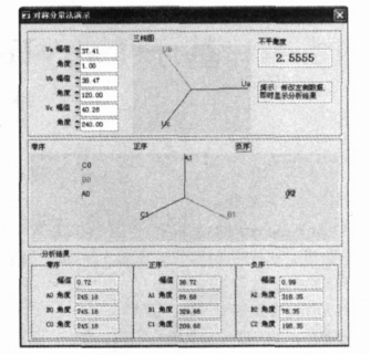 三相基波用自相關(guān)分析函數(shù)Correlate ( ) 可以得到;復(fù)數(shù)計算時將上述公式簡化后采用實部和虛部分別計算;其他計算用LabWindows/ CVI 語句描述出來計算即可。系統(tǒng)中提供了直觀的各相矢量坐標(biāo)圖及零序、正序和負(fù)序分量演示,便于用戶查看,如圖5 所示。