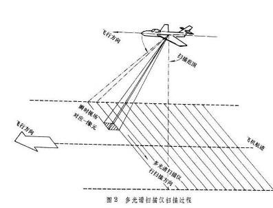 掃描儀安裝在飛行器上。掃描儀的掃描鏡旋轉(zhuǎn),使接收的瞬時視場作垂直于飛行方向的運動,從而實現(xiàn)行掃描(圖2)。由于飛行器的向前運動,掃描儀遂完成二維掃描。地物景像被逐點掃過,并逐點分波段測量,從而獲得多光譜的遙感圖像信息。