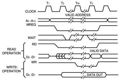 在讀取或?qū)懭胫芷谥,Z80先把一個地址放在地址總線上,然后確認MREQ,表明這個地址對存儲器讀取或?qū)懭胧怯行У摹W詈,確認RD或 WR線路,具體視操作是讀取還是寫入而定。只有在總線上的數(shù)據(jù)有效后,才確認WR線路。因此,定時