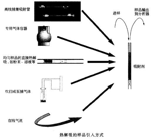 放人解吸管的樣品來源可以是用以直接解吸的固體、液體、氣體樣品,也可以是吸附有待測組分的吸附管(捕集管)。常見的熱解吸的樣品引入方式如圖所示。