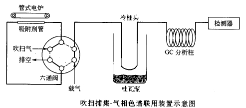 吹掃捕集-氣相色譜法聯(lián)用裝置如圖所示。吸附和脫附通過六通閥來完成,為減少吸附效應(yīng),閥體應(yīng)固定在插有加熱體的厚金屬板上并保持溫度在200℃ ,用管式電爐加熱吸附劑管進(jìn)行加熱脫附。若需要在低溫下吸附時(shí),可把吸附劑管置于冷阱中,冷柱頭與六通閥連接,在吸附劑管加熱脫附時(shí),該毛細(xì)管柱放人裝有液氮的杜瓦瓶中將組分集中在分析柱的柱頭,對(duì)提高分析柱的分析能力很有利。解吸出的待測(cè)組分經(jīng)GC 分析柱進(jìn)行測(cè)定。