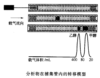 泄漏體積是一個(gè)與吸附劑吸附能力有關(guān)的參量,指特定溫度下某化合物被吹掃而完全通過捕集管內(nèi)1.0g吸附劑時(shí)所需的載氣體積困,簡而言之,即分析物的保留體積。分析物在捕集管中的轉(zhuǎn)移過程如圖所示,捕集管長5~30cm 、直徑約0.6cm ,吸附劑質(zhì)量在1.0g左右。