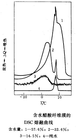 例如利用DSC 對(duì)不同含水量的醋酸纖維素膜進(jìn)行測(cè)定,如下圖所示。經(jīng)分析,在醋酸纖維素膜中存在著四種狀態(tài)的水:完全游離的水(8 ℃ 附近的陡峰部分)、與膜相互作用很弱的游離水(寬峰部分)、含鹽結(jié)合水(與膜結(jié)合得強(qiáng)的水)和不含鹽的結(jié)合水。