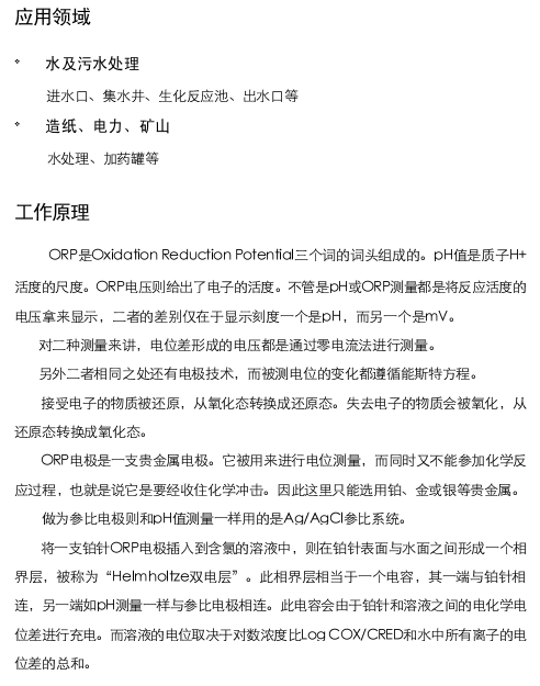 在線ORP計性能特點: 采用國際先進的環(huán)形大截面的Teflon隔膜,使電極具有穩(wěn)定的液接界; 獨特的結(jié)構(gòu),使電極不易被污染,堵塞,使壽命延長;參與系統(tǒng)采用高分子聚合物填充,使用極為方便,無需補充電解液電極適用于各種污染嚴(yán)重的介質(zhì),可防S2-,NH4+,CN-干擾。