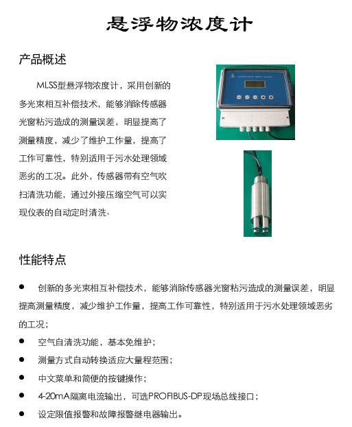 JKMLSS型懸浮物濃度計,采用創(chuàng)新的多光束相互補(bǔ)償技術(shù),能夠消除傳感器光窗粘污造成的測量誤差,明顯提高測量精度,減少維護(hù)工作量,提高工作可靠性,特別適用于污水處理領(lǐng)域惡劣的工況。此外,傳感器帶有空氣吹掃清洗功能,通過外接壓縮空氣可以實現(xiàn)儀表的自動定時清洗功能