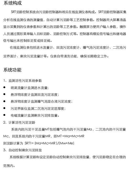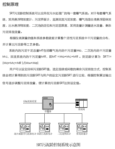 SRT污泥齡控制系統(tǒng)是我們專門針對(duì)剩余污泥排放而研究開發(fā)的自動(dòng)控制系統(tǒng)。該系統(tǒng)自動(dòng)測(cè)量污泥齡并根據(jù)設(shè)定污泥齡自動(dòng)控制剩余污泥排放,能夠提高工藝運(yùn)行效率,減少排泥泵的能耗。