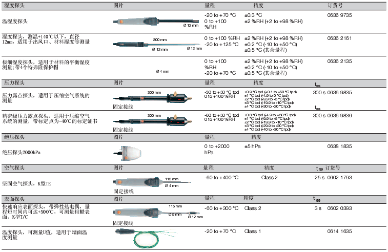 testo 635-1溫濕度儀,帶有電池和標定證書 可選擇用戶菜單,例如,功能鍵分別對應特定的應用場合,在菜單提示下進行便捷的操作。數(shù)據(jù)通過紅外接口傳輸?shù)降聢D打印機。使用特 殊探頭,可直接測試材料的含濕量。 testo 635通過顯示環(huán)境空氣與墻面的露點差值,分析天花板和墻面的濕度。高精度探頭可測量高達-60℃ tpd的露點值,用于檢測空氣壓縮系統(tǒng)的壓力露點。 testo635-1溫濕度計優(yōu)點一覽: · 通過德圖打印機打印測量數(shù)據(jù) · 循環(huán)打印讀數(shù),例如,每分鐘打印一次 · 測量空氣濕度、材料含濕量以及壓縮空氣系統(tǒng)的壓力露點 · 顯示露點差值,最大/最小值,平均值 · 保護等級 IP 54 testo635-2溫濕度計優(yōu)點一覽: · 內(nèi)存高達10,000 組數(shù)據(jù) · PC軟件,用于分析、管理和歸檔測量數(shù)據(jù) · 測量空氣濕度,測量平衡濕度和壓力露點 · 防水等級IP54 · 根據(jù)自由設(shè)定的特性曲線,直接顯示材料含濕量(以材料平衡濕度為基礎(chǔ)) · 將測量數(shù)據(jù)保存到相應的測量點目錄下 · 內(nèi)置用戶菜單,直接進入重要功能的操作界面
