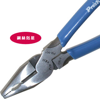 PM-901, 克鋼8"電工鉗(215mm)藍色PVC手把[電工剪鉗類]. 全長: 215mm. 刀口硬度達HRC60±2º. 省力偏芯設(shè)計, 并具粗牙螺絲咬合孔. 表面以磷酸鹽處理、防銹力特佳