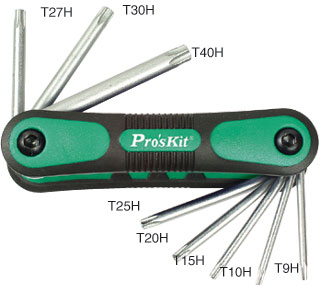 HW-121L, 折疊型星孔扳手組(8支組)T9H~T40[六角扳手類]. 規(guī)格: T9H, T10H, T15H, T20H, T25H, T27H, T30H, T40H. 材質(zhì): SAE6150 鉻釩鋼. 底座: TPR雙色防滑成型. 本體: 霧鉻處理